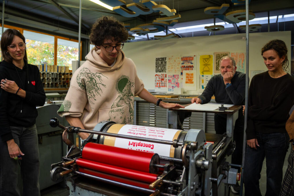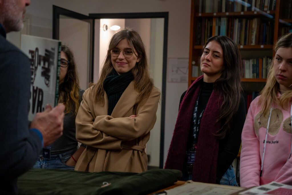 Ma il momento più coinvolgente della giornata è stato il laboratorio pratico. Gli studenti hanno provato in prima persona a comporre, imprimere e stampare i propri caratteri tipografici. Dopo aver assemblato con cura le lettere e sistemato il tutto nella pressa, ruotando una manovella hanno impresso l’inchiostro sulla carta, dando vita a una stampa unica e personalizzata.