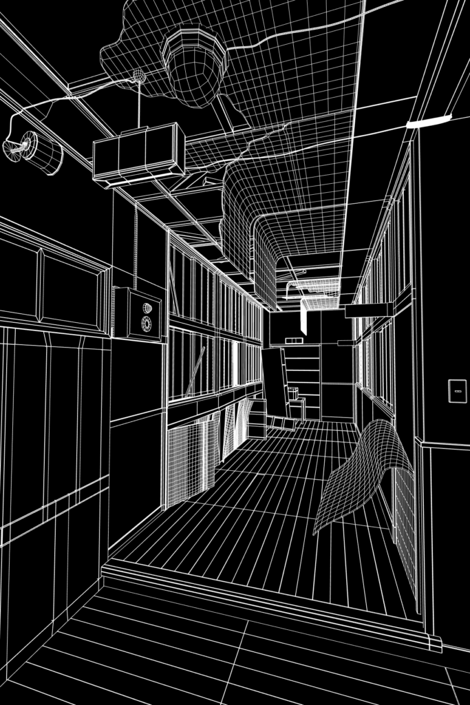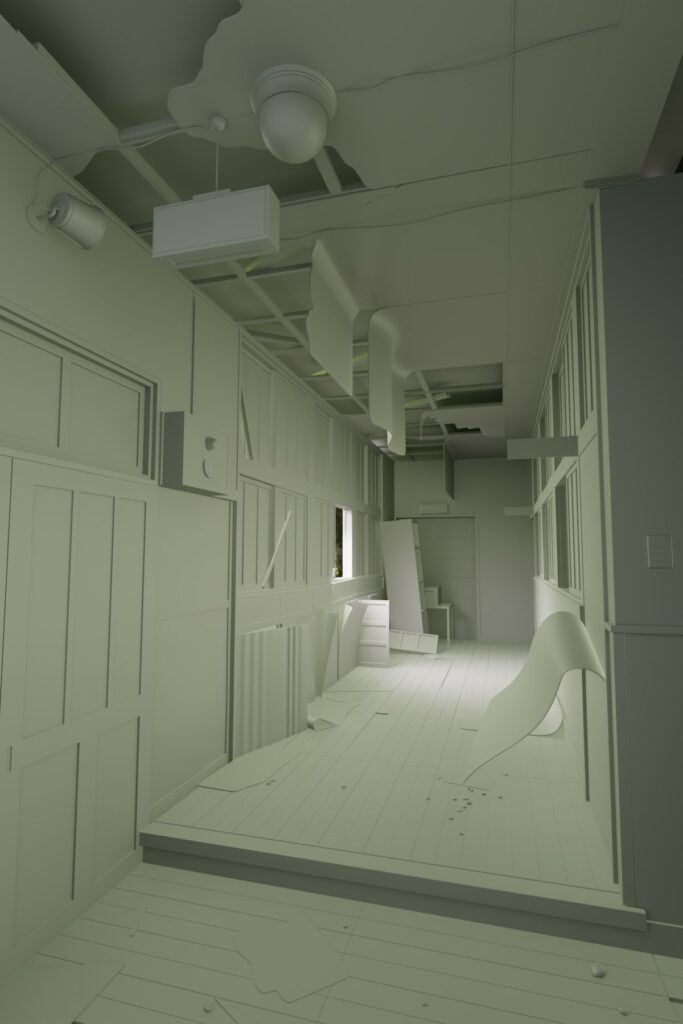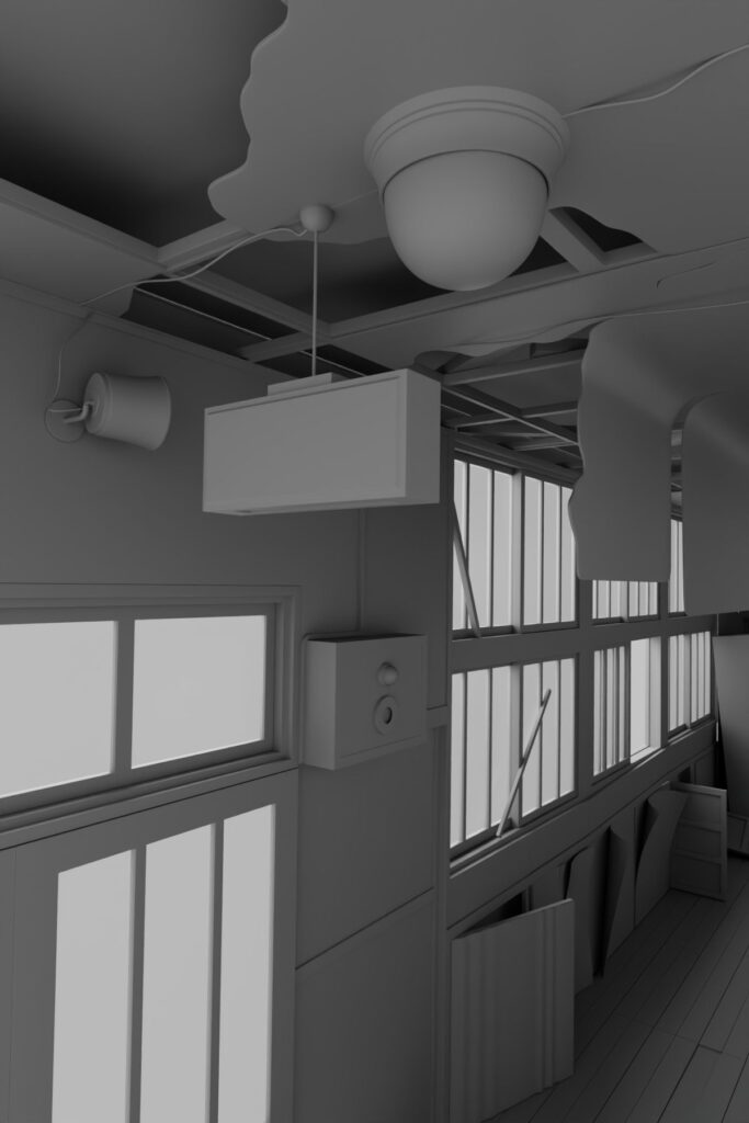 Sabrina ha iniziato dal blocco delle forme principali (muri, finestre e strutture portanti) per poi procedere con l’aggiunta dei dettagli, come luci, cavi e fogli di carta posizionati a terra.