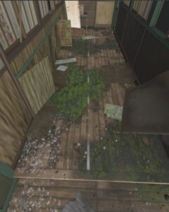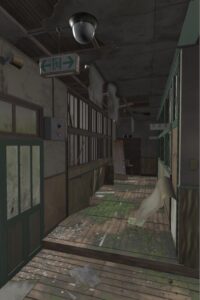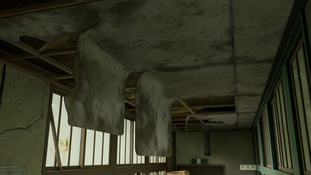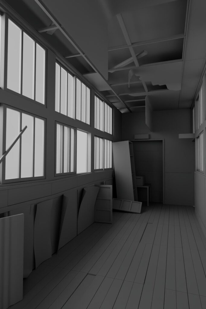 Durante la fase di ricerca delle reference per questo progetto, il suo interesse si è rivolto agli ambienti abbandonati: luoghi ideali per sperimentare texture complesse e stratificate. La scelta finale è ricaduta sull’immagine di un corridoio di una vecchia scuola giapponese in rovina.