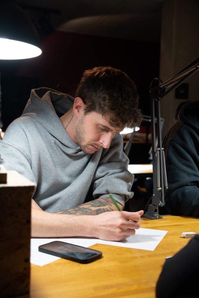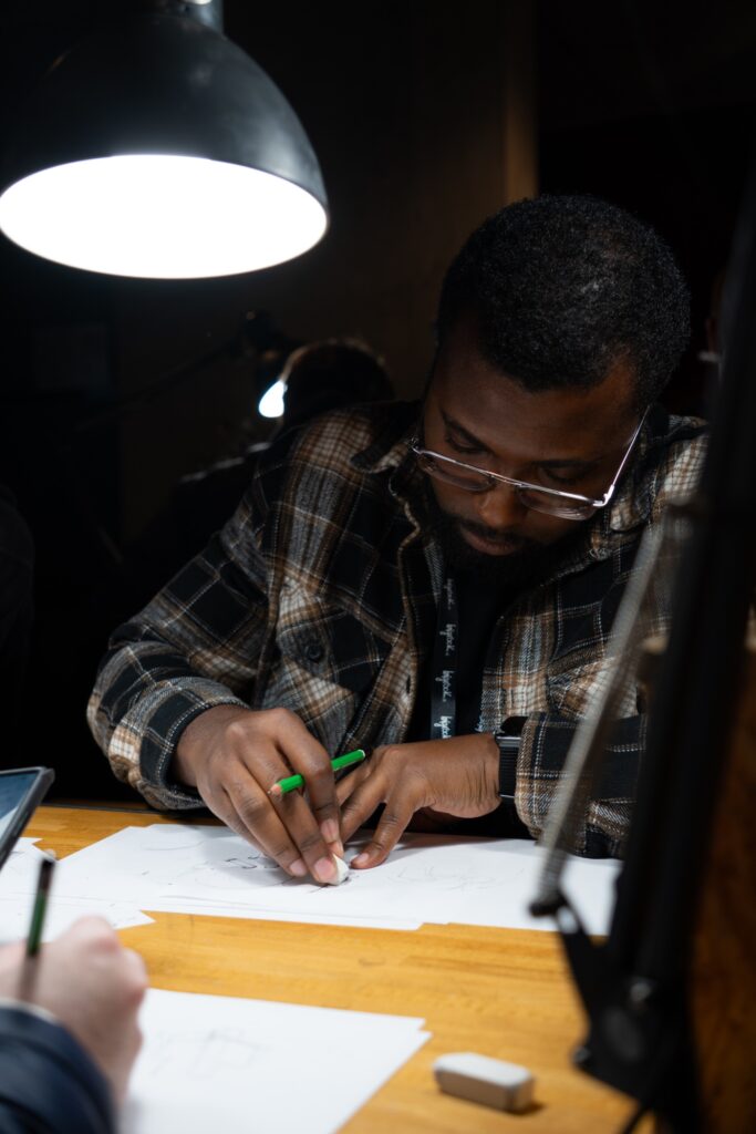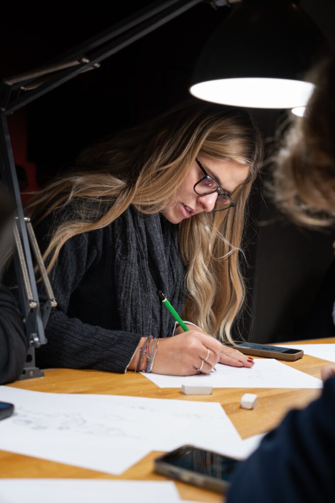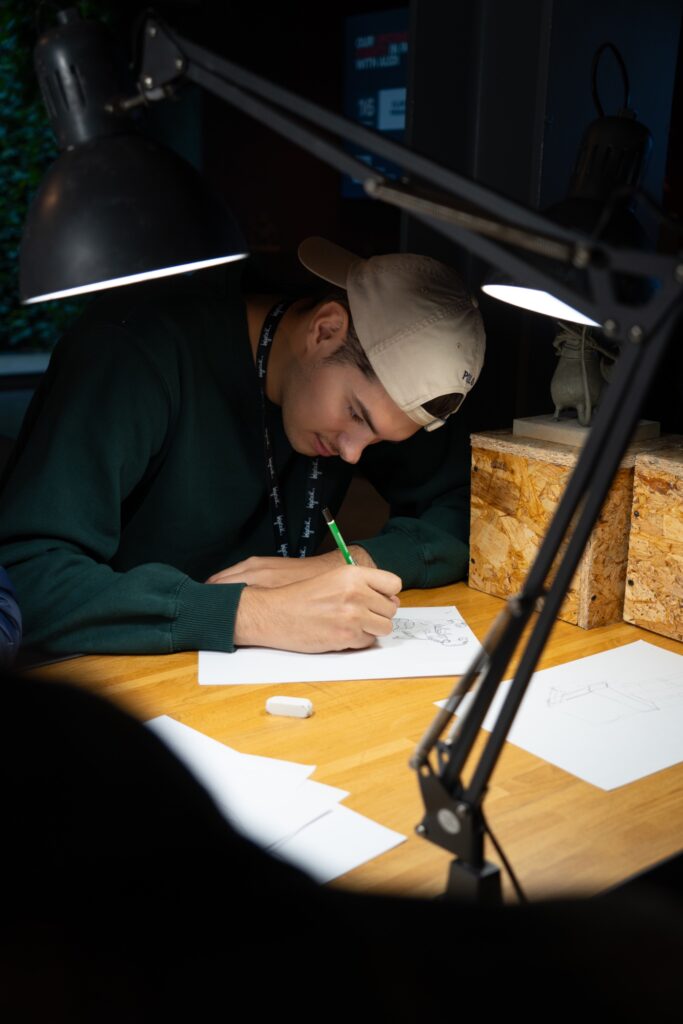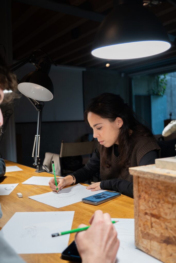 Durante il workshop, gli studenti hanno affrontato un esercizio tutt’altro che banale: tradurre le proprie idee in segni rapidi e mirati, lavorando solo con carta e matita.